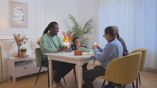 In the cooperative children's game Dixit Kids, you work together to invite as many guests as possible to the Swift Rabbit's big birthday party! In each round, one of you takes on the role of the Swift Rabbit. They visit a rabbit burrow and choose one of the rabbits to be their birthday guest. The Swift Rabbit then selects a card from their hand that matches the guest's mood: this card is the invitation.
